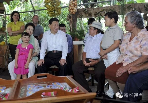 2013年6月3日,正在哥斯達黎加進行國事訪問的國家主席習近平和夫人彭麗媛走訪當?shù)剞r戶薩莫拉一家。這是習近平與當?shù)剞r戶薩莫拉一家人親切交流。 新華社記者張鐸攝