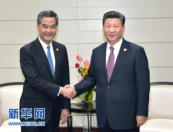 11月20日,國家主席習近平在秘魯首都利馬會見前來出席亞太經(jīng)合組織第二十四次領導人非正式會議的香港特別行政區(qū)行政長官梁振英。新華社記者 李濤 攝
