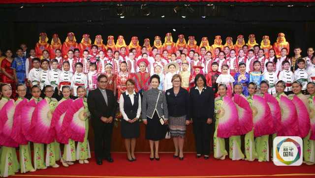 ??? 在學(xué)校禮堂,彭麗媛觀看學(xué)生文藝演出。學(xué)生們表演了合唱《歌聲與微笑》《在希望的田野上》,中秘兒童服裝表演、武術(shù)和扇子舞等。演出結(jié)束后彭麗媛與全體演員合影,感謝他們的精彩演出。