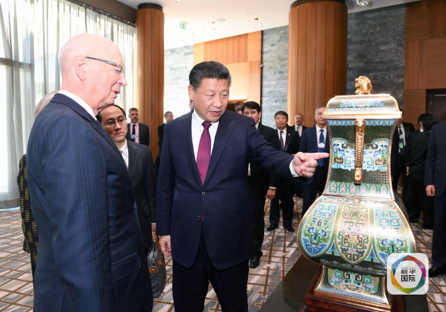 1月17日,國家主席習(xí)近平在瑞士達沃斯會見世界經(jīng)濟論壇主席施瓦布。這是習(xí)近平向施瓦布介紹中華人民共和國贈送給世界經(jīng)濟論壇的四面方尊。(新華社記者 饒愛民 攝)