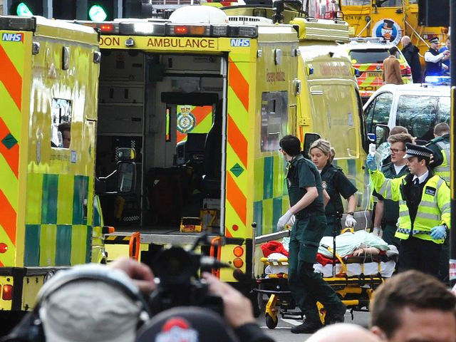 3月22日,倫敦議會大廈外,救援人員將一名傷者推向救護(hù)車。(新華/法新)