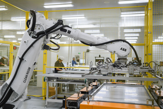 中德智能制造合作試點(diǎn)示范項(xiàng)目——正泰光伏組件智能工廠。(新華社記者申宏攝)
