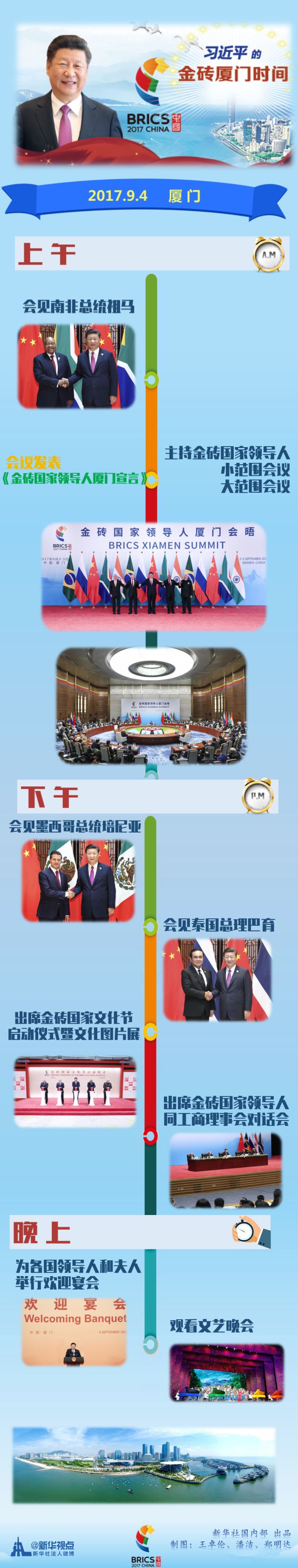 廈門,顧名思義是“大廈之門”。我衷心希望廈門會晤為我們開啟新的合作之門、發(fā)展之門,迎來金磚合作第二個“金色十年”,開辟新興市場國家和發(fā)展中國家光明未來。