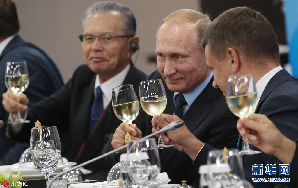 當(dāng)?shù)貢r間2017年9月6日,俄羅斯符拉迪沃斯托克,俄羅斯總統(tǒng)普京在遠東聯(lián)邦大學(xué)會晤出席2017東方經(jīng)濟論壇的外商。(圖片來源:東方IC)
