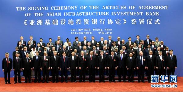 【正式成立】2015年12月25日,歷經(jīng)800余天籌備,由中國倡議成立、57國共同籌建的亞洲基礎(chǔ)設(shè)施投資銀行(亞投行)于當(dāng)日正式成立,全球迎來首個由中國倡議設(shè)立的多邊金融機(jī)構(gòu)。圖為2015年6月29日,國家主席習(xí)近平在北京人民大會堂會見出席《亞洲基礎(chǔ)設(shè)施投資銀行協(xié)定》簽署儀式的各國代表團(tuán)團(tuán)長。
