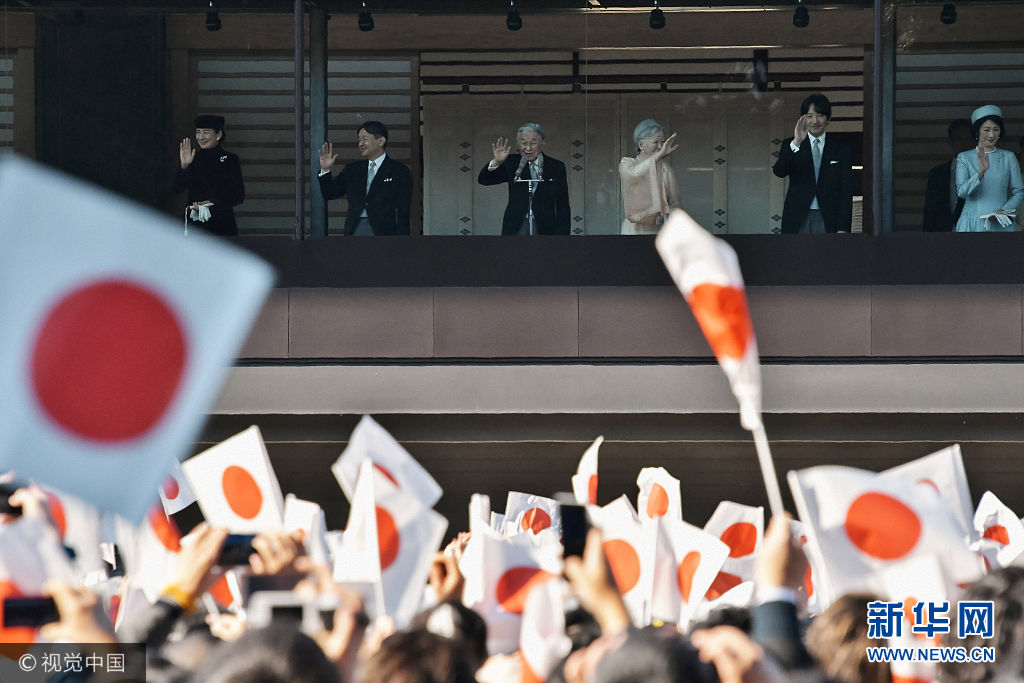 當?shù)貢r間2017年12月23日,日本東京,日本明仁天皇慶祝84歲生日,在皇宮的陽臺上向祝福者揮手致意。(圖片來源:視覺中國)