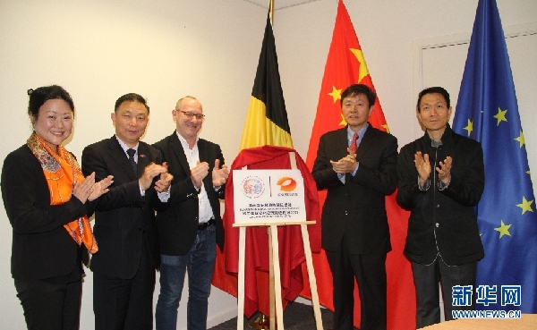 中國駐歐盟使團公使銜參贊李建民(前排左二)、中國駐比利時大使館文化參贊向世海(前排右一)、湖南衛(wèi)視國際頻道總監(jiān)甘霖(前排右二)和比利時法語廣播電視臺的特別代表(前排左三)共同為聯(lián)絡處揭牌。新華網(wǎng)發(fā)(潘革平攝)