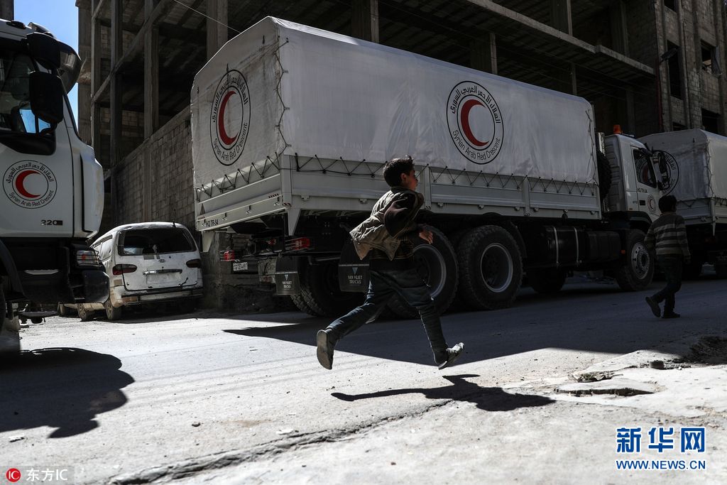 當(dāng)?shù)貢r(shí)間2018年3月9日,敘利亞,推遲多日后,人道主義救援物資進(jìn)入東古塔反政府武裝控制區(qū)并完成卸貨,共13卡車物資當(dāng)天上午從瓦菲丁通道進(jìn)入杜馬區(qū)。(圖片來源:東方IC)