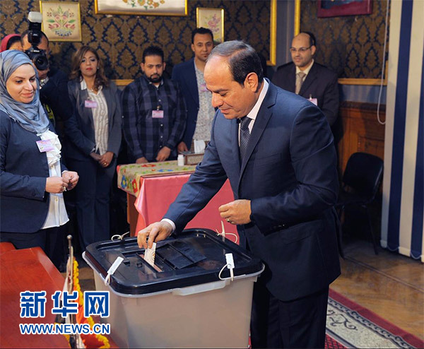 這張資料照片顯示的是,3月26日,塞西在埃及首都開羅一個投票站參加總統(tǒng)選舉投票。新華社/中東社