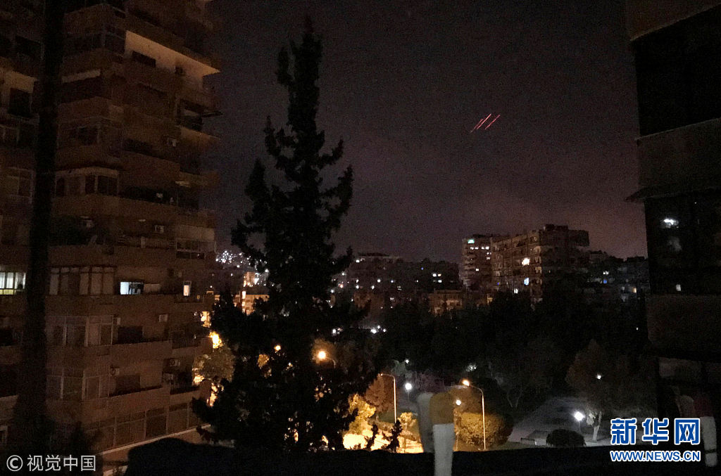 4月14日,敘利亞大馬士革,特朗普決定聯(lián)合英國和法國對敘利亞進(jìn)行精確打擊,大馬士革傳出爆炸聲,敘利亞方面進(jìn)行反擊。敘利亞阿拉伯?dāng)⒗麃喭ㄓ嵣?SANA)報道,敘政府軍在大馬士革以南地區(qū)擊落13枚導(dǎo)彈。敘利亞國家電視臺此前稱美英法三國對敘利亞“發(fā)動了侵略”。(圖片來源:視覺中國)