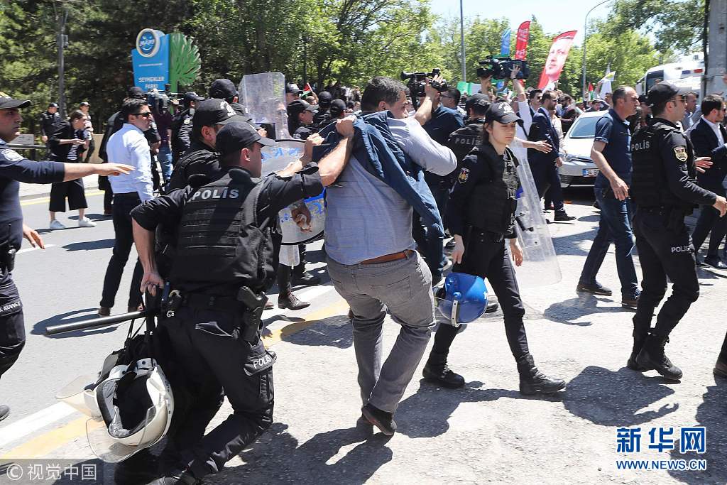 5月15日,土耳其安卡拉,示威者在以色列領(lǐng)事館附近投擲雞蛋和石塊,抗議美國(guó)駐以色列使館遷至耶路撒冷。(圖片來源:視覺中國(guó))