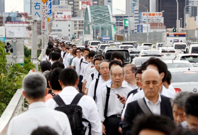 6月18日,在日本大阪,人們在火車和地鐵因地震暫停后步行經(jīng)過一座橋梁。(新華社/美聯(lián))