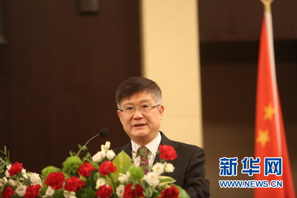 中國駐白俄羅斯大使崔啟明在獎學(xué)金頒發(fā)典禮上致辭。新華網(wǎng)記者 魏忠杰攝