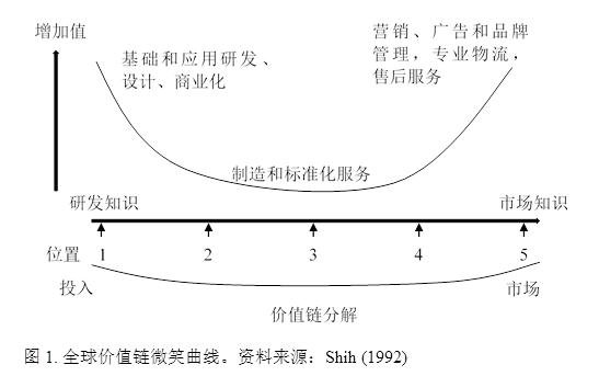 全球價(jià)值鏈構(gòu)建了一個(gè)跨國(guó)或者跨地區(qū)不同公司實(shí)現(xiàn)不同的工序和商業(yè)功能的生產(chǎn)架構(gòu)(Grossman和Rossi-Hansberg,2012)。這個(gè)架構(gòu)是“生產(chǎn)性的(價(jià)值增長(zhǎng)的)通向并且支持最終使用的順序” (Sturgeon 2001)。微笑曲線提出了一種不同的解構(gòu)國(guó)際貿(mào)易的方法。有些國(guó)家專業(yè)化“生產(chǎn)”知識(shí)與研發(fā),而另一些國(guó)家專業(yè)化于制造業(yè),或者品牌營(yíng)銷。因此,一個(gè)產(chǎn)品的增加值不再是完全屬于某一個(gè)國(guó)家,而是整條價(jià)值鏈上的參與者都可以分一杯羹。在為最終產(chǎn)品貢獻(xiàn)價(jià)值的生產(chǎn)工序的鏈條上(既,產(chǎn)品的價(jià)值鏈),一般的工序鏈條開(kāi)始于基礎(chǔ)和應(yīng)用研究與設(shè)計(jì)。這些研究與設(shè)計(jì)活動(dòng)往往會(huì)帶來(lái)新的想法、技術(shù)、新產(chǎn)品設(shè)計(jì)和新的生產(chǎn)工藝。這個(gè)工序鏈條下一環(huán)節(jié)是商業(yè)化這些研究成果,如專利和知識(shí)產(chǎn)權(quán)(想法、論文、知識(shí)等);再下一環(huán)節(jié)是資源的獲取和材料的生產(chǎn)(包括農(nóng)業(yè)產(chǎn)品),零部件的生產(chǎn)和產(chǎn)品的組裝,以及最后環(huán)節(jié)的營(yíng)銷、廣告、品牌管理、物流、商業(yè)服務(wù)和售后服務(wù)。另外,價(jià)值鏈在文獻(xiàn)中的定義是超出中間品貿(mào)易的,它強(qiáng)調(diào)在不同環(huán)節(jié)上領(lǐng)先企業(yè)與供應(yīng)商之間的權(quán)力架構(gòu) (Milberg,2004)。