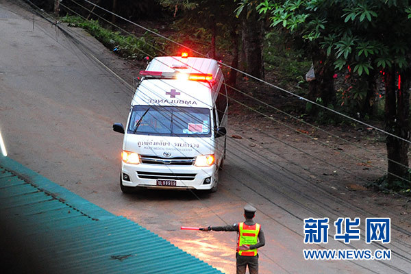 這是7月8日在泰國(guó)清萊拍攝的運(yùn)送被解救出的少年足球隊(duì)員的救護(hù)車。新華社發(fā)(拉亨 攝)