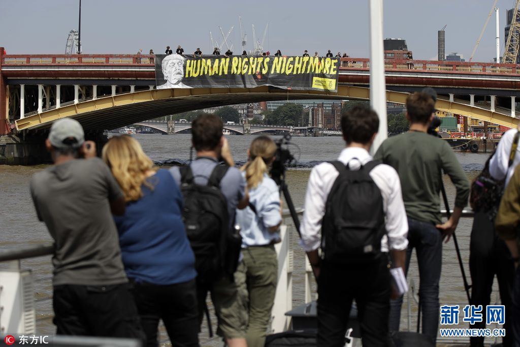 7月12日,英國(guó)倫敦,國(guó)際特赦組織成員在倫敦泰晤士河上沃克斯豪爾橋懸掛橫幅,抗議美國(guó)總統(tǒng)特朗普到訪英國(guó)。(圖片來源:東方IC)