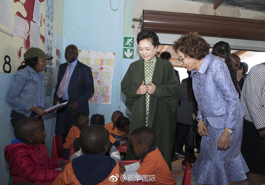 當?shù)貢r間7月24日上午,國家主席習近平夫人、聯(lián)合國教科文組織促進女童和婦女教育特使彭麗媛在南非總統(tǒng)夫人莫采佩陪同下,參觀位于比勒陀利亞東郊的烏坦多社區(qū)托兒所。 新華社記者 王曄 攝