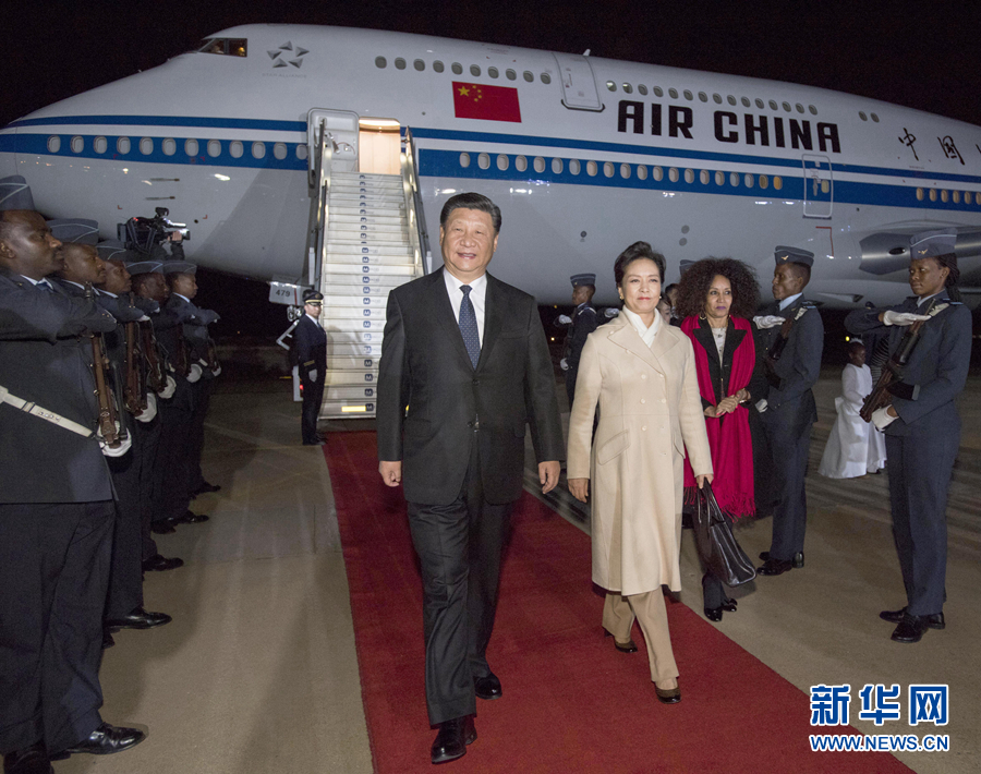 7月23日,國家主席習近平抵達比勒陀利亞,開始對南非共和國進行國事訪問。習近平和夫人彭麗媛在機場受到南非外長西蘇魯?shù)日呒壒賳T熱情迎接。新華社記者李學仁攝