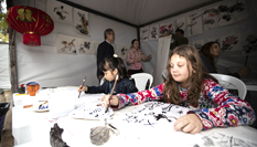 圍繞著中央舞臺(tái),剪紙、書法、針灸等展位前人頭攢動(dòng),吸引了許多聞?dòng)嵍鴣淼娜A僑華人和當(dāng)?shù)孛癖?。巴西瓦加斯基金?huì)華人教授夏華聲帶著兩個(gè)兒子前來參加活動(dòng)。