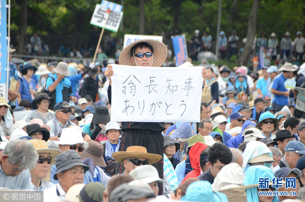 當(dāng)?shù)貢r間2018年8月11日,日本沖繩縣約7萬民眾8月11日在那霸市舉行大規(guī)模集會,反對駐日美軍將普天間基地遷往名護(hù)市邊野古地區(qū),要求駐日美軍放棄在邊野古地區(qū)新建基地并立即關(guān)閉普天間機(jī)場。當(dāng)天,日本東京都、大阪府、福岡、北海道縣等地民眾也同時舉行集會和游行,抗議日本政府推進(jìn)邊野古地區(qū)填海施工。(圖片來源:視覺中國)