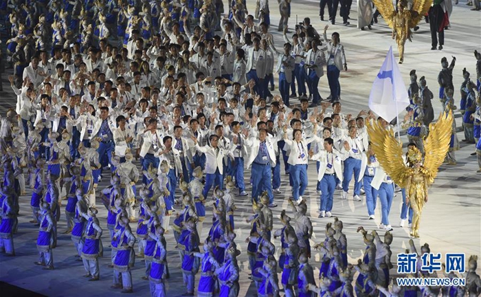 8月18日,第18屆亞運(yùn)會(huì)開幕式在印度尼西亞雅加達(dá)舉行。這是朝韓兩國代表團(tuán)在開幕式上舉“朝鮮半島旗”共同入場(chǎng)(8月18日攝)。新華社記者潘昱龍攝