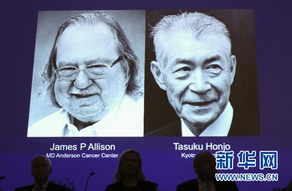 10月1日,在瑞典斯德哥爾摩卡羅琳醫(yī)學(xué)院舉行的新聞發(fā)布會現(xiàn)場,大屏幕顯示美國科學(xué)家詹姆斯·艾利森(左)和日本科學(xué)家本庶佑的照片。 新華社記者葉平凡攝