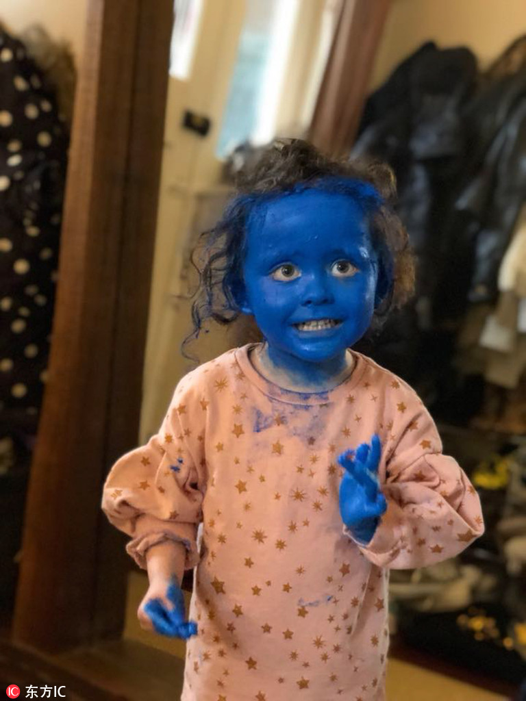 2018年4月17日報道,國外3歲的小女孩Eve把自己涂抹成了“藍精靈”!(圖片來源:東方IC)
