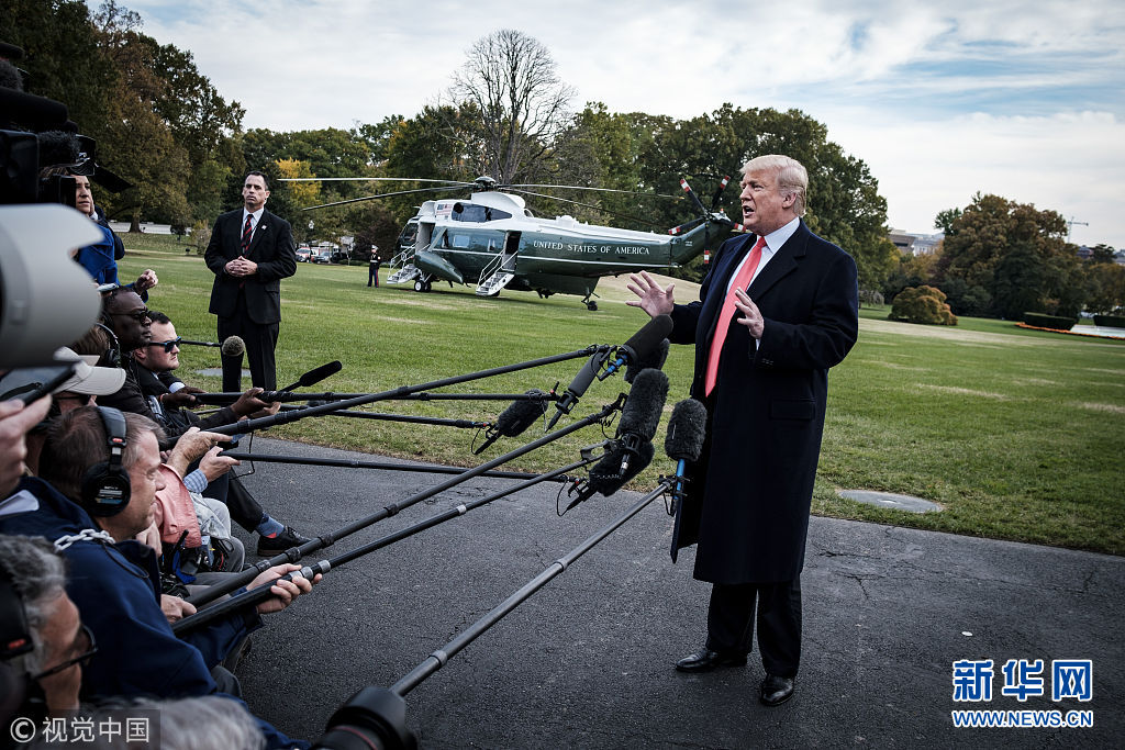 當(dāng)?shù)貢r間2018年10月31日,美國華盛頓,美國總統(tǒng)特朗普啟程前往佛羅里達州出席競選集會,在白宮南草坪發(fā)表講話。特朗普稱,計劃部署在美墨邊境的現(xiàn)役軍人數(shù)量或增加至15000人,以嚴防來勢洶洶的“大篷車”移民。(圖片來源:視覺中國)