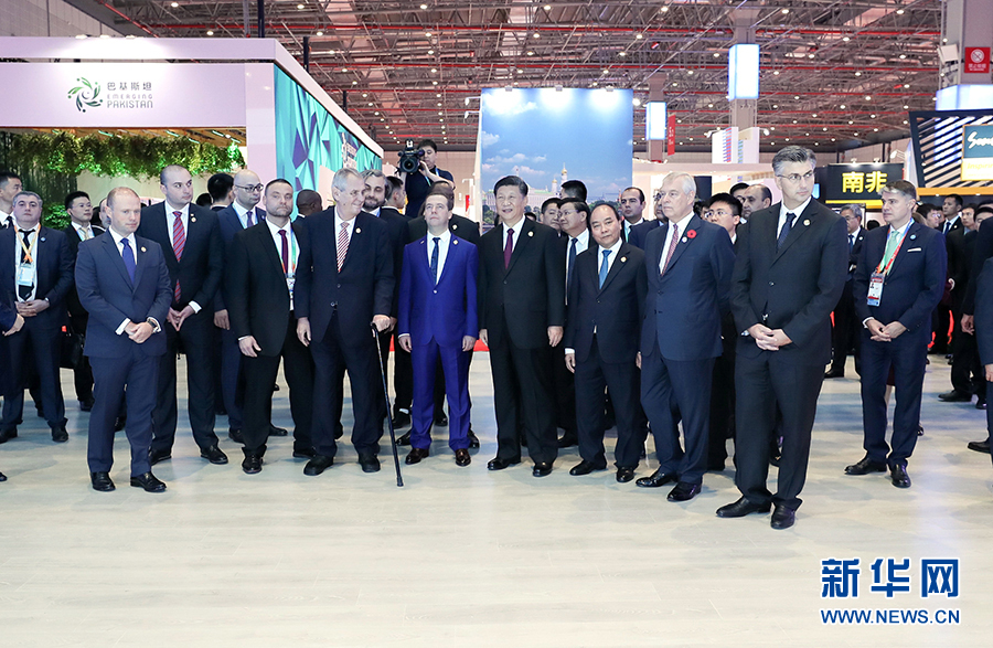 中午,習(xí)近平同外國(guó)領(lǐng)導(dǎo)人一同步入國(guó)家貿(mào)易投資綜合展展廳。他們邊走邊看,邊看邊談,先后參觀了匈牙利、埃及、英國(guó)、捷克、肯尼亞、薩爾瓦多、多米尼加、老撾、格魯吉亞、越南、巴基斯坦、俄羅斯等國(guó)展區(qū),了解各國(guó)經(jīng)貿(mào)發(fā)展成就和特色優(yōu)勢(shì)產(chǎn)品。習(xí)近平和各國(guó)領(lǐng)導(dǎo)人通過(guò)視頻欣賞了匈牙利的美麗風(fēng)光、領(lǐng)略了埃及的悠久文明和現(xiàn)代發(fā)展規(guī)劃,共同體驗(yàn)了英國(guó)館炫酷時(shí)尚的裸眼3D視頻。在捷克館,澤曼總統(tǒng)用捷克產(chǎn)鋼琴即興演奏一曲,并邀請(qǐng)習(xí)近平品嘗捷克啤酒。肯尼亞的鮮花、薩爾瓦多的咖啡、多米尼加的水果,琳瑯滿(mǎn)目的各國(guó)特色產(chǎn)品吸引中外領(lǐng)導(dǎo)人頻頻駐足。格魯吉亞總理和越南總理親自向習(xí)近平推介本國(guó)農(nóng)產(chǎn)品和旅游項(xiàng)目。老撾館的中老鐵路項(xiàng)目沙盤(pán)和巴基斯坦館的中巴經(jīng)濟(jì)走廊展板分別展現(xiàn)了中老、中巴共建“一帶一路”、實(shí)現(xiàn)共同發(fā)展的美好愿景。在俄羅斯館,習(xí)近平在梅德韋杰夫總理陪同下聽(tīng)取中俄在核電、天然氣、飛機(jī)制造、地方交往等領(lǐng)域合作成就介紹,共同展望中俄合作的廣闊前景。