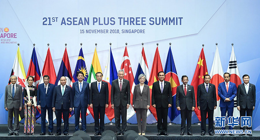 11月15日,國務(wù)院總理李克強(qiáng)在新加坡會展中心出席第21次東盟與中日韓(10+3)領(lǐng)導(dǎo)人會議。這是與會領(lǐng)導(dǎo)人集體合影。 新華社記者 申宏 攝