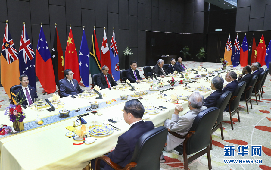 11月16日,國家主席習近平在莫爾茲比港同巴布亞新幾內(nèi)亞總理奧尼爾、密克羅尼西亞聯(lián)邦總統(tǒng)克里斯琴、薩摩亞總理圖伊拉埃帕、瓦努阿圖總理薩爾瓦伊、庫克群島總理普納、湯加首相波希瓦、紐埃總理塔拉吉等建交太平洋島國領(lǐng)導人以及斐濟政府代表、國防部長昆布安博拉舉行集體會晤。習近平主持會晤并發(fā)表主旨講話。 新華社記者 謝環(huán)馳 攝