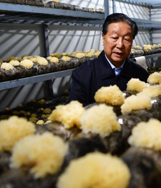 福建農(nóng)林大學(xué)研究員林占熺在查看利用巨菌草碎渣來培育的銀耳。新華社記者 魏培全 攝