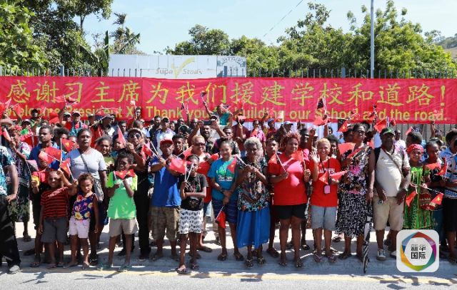 2018年11月16日,巴布亞新幾內(nèi)亞首都莫爾茲比港。當(dāng)?shù)孛癖娋奂谥袊?guó)-巴新友誼學(xué)?!げ紙D卡學(xué)園門口,等待習(xí)近平主席到來(lái)。(新華社記者龐興雷攝)