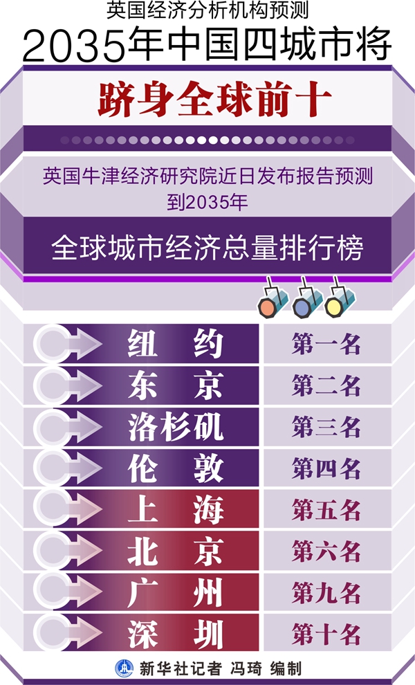 英國經(jīng)濟分析機構(gòu)預(yù)測2035年中國四城市將躋身全球前十 新華社記者 馮琦 編制