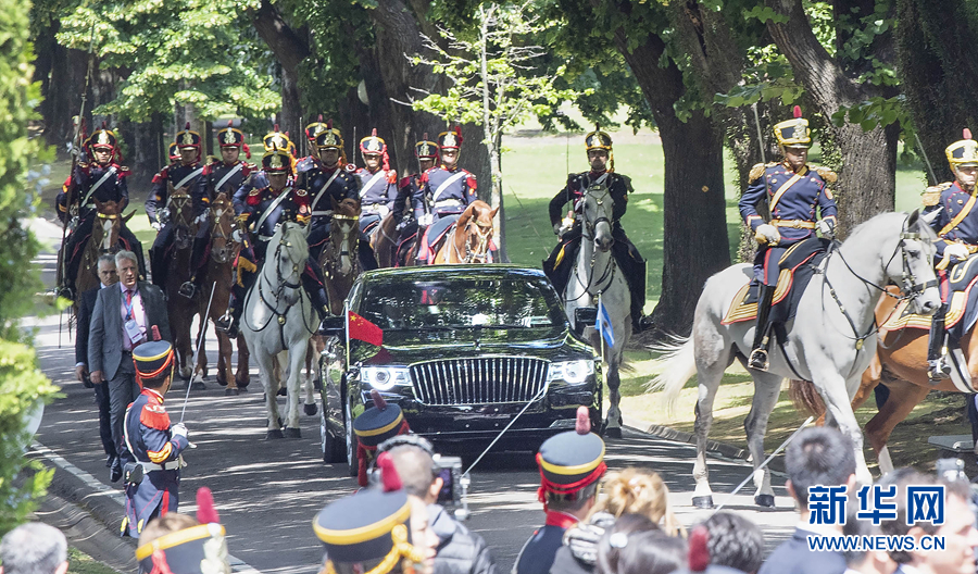 習(xí)近平和夫人彭麗媛在馬隊(duì)護(hù)衛(wèi)下前往總統(tǒng)官邸,禮兵在林蔭大道兩側(cè)列隊(duì)接受檢閱。抵達(dá)榮譽(yù)廣場時(shí),軍樂團(tuán)奏響歡快的進(jìn)行曲。馬克里和夫人阿瓦達(dá)上前熱情迎接。兩國元首夫婦登上檢閱臺(tái)。軍樂團(tuán)奏中國、阿根廷兩國國歌。