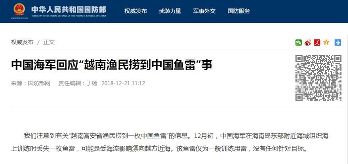 我們注意到有關(guān)“越南富安省漁民撈到一枚中國魚雷”的信息。12月初,中國海軍在海南島東部附近海域組織海上訓(xùn)練時(shí)丟失一枚魚雷,可能是受海流影響漂向越方近海。該魚雷僅為一般訓(xùn)練用雷,沒有任何針對目標(biāo)。