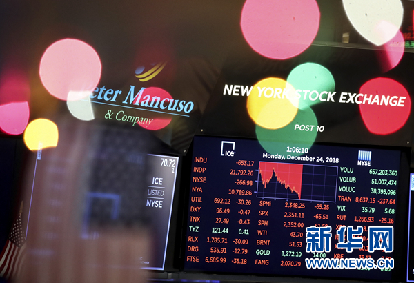 12月24日,美國紐約證券交易所的電子屏顯示當(dāng)日交易信息。 紐約股市三大股指24日收盤下跌。截至當(dāng)天收盤,道瓊斯工業(yè)平均指數(shù)比前一交易日下跌653.17點,收于21792.20點,跌幅為2.91%。標(biāo)準(zhǔn)普爾500種股票指數(shù)下跌65.52點,收于2351.10點,跌幅為2.71%。納斯達(dá)克綜合指數(shù)下跌140.08點,收于6192.92點,跌幅為2.21%。 新華社記者 王迎 攝