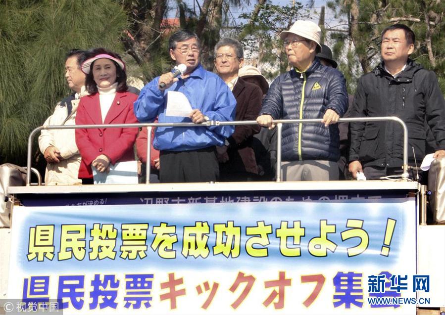 日本沖繩民眾在美軍營前集會 呼吁投票反對美軍基地搬遷計劃