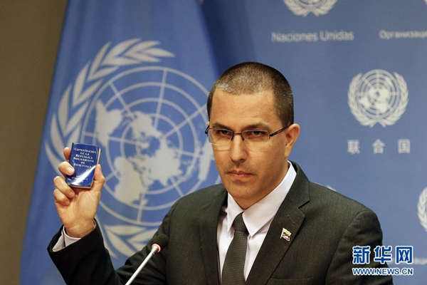 2月12日,在位于紐約的聯(lián)合國總部,委內瑞拉外交部長阿雷亞薩出席記者會。新華社記者 李木子 攝