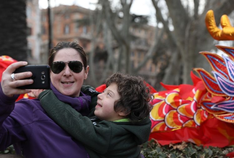 2019年2月10日在意大利羅馬,一對母子在羅馬僑界歡度2019年春節(jié)活動上自拍。(新華社記者程婷婷攝)