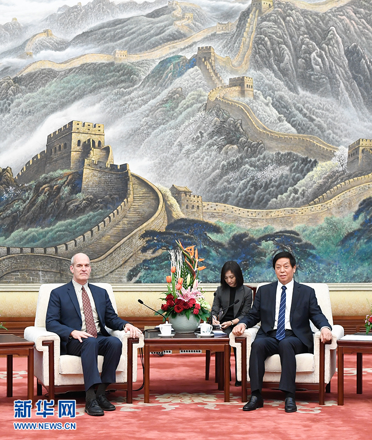 3月22日,全國(guó)人大常委會(huì)委員長(zhǎng)栗戰(zhàn)書在北京人民大會(huì)堂會(huì)見(jiàn)美國(guó)眾議院“美中工作小組”代表團(tuán)。 新華社記者申宏攝