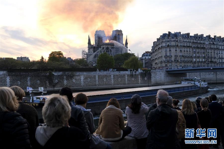 4月15日,在法國巴黎,人們圍觀著火的巴黎圣母院。新華社發(fā)(亞歷山大·卡曼 攝)
