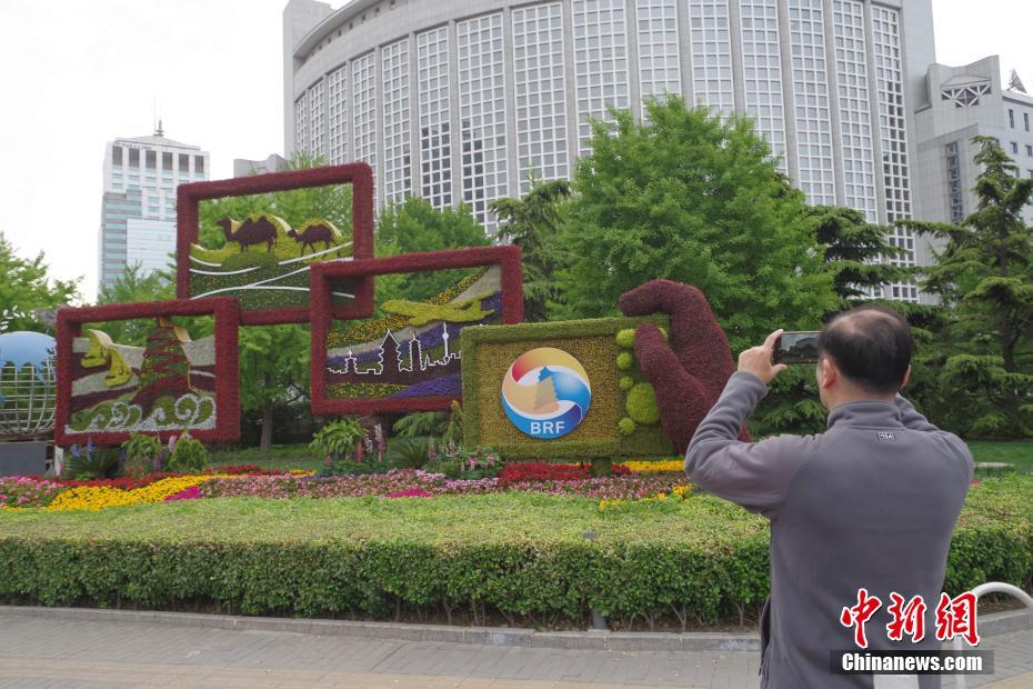 4月18日,北京朝陽門的“一帶一路”主題花壇吸引市民拍照。第二屆“一帶一路”國際合作高峰論壇即將在北京舉行,北京市內(nèi)布置了多個(gè)主題花壇迎接盛會(huì)。中新社記者 賈天勇 攝