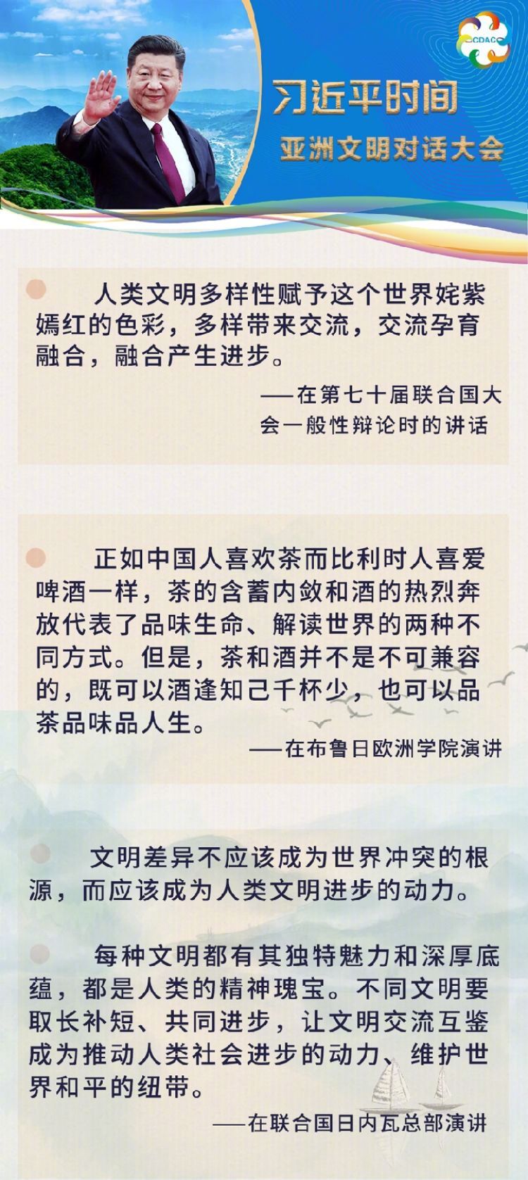“在漫長歷史長河中,如亞洲的黃河和長江流域、印度河和恒河流域、幼發(fā)拉底河和底格里斯河流域以及東南亞等地區(qū)孕育了眾多古老文明,彼此交相輝映、相得益彰,為人類文明進步作出了重要貢獻。今天的亞洲,多樣性的特點仍十分突出,不同文明、不同民族、不同宗教匯聚交融,共同組成多彩多姿的亞洲大家庭。”