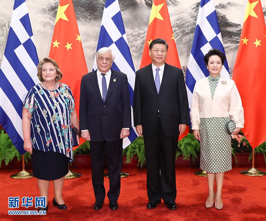 5月14日,國家主席習(xí)近平在北京人民大會堂同希臘總統(tǒng)帕夫洛普洛斯舉行會談。這是習(xí)近平和夫人彭麗媛同帕夫洛普洛斯夫婦合影。 新華社記者 鞠鵬 攝