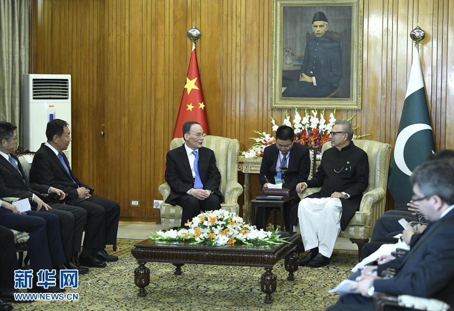 會見阿爾維時,王岐山表示,中巴是“鐵桿”朋友。建交68年來,無論國際風云如何變幻,兩國始終在涉及彼此核心利益問題上相互尊重、相互支持,結下了最真誠的友誼。近年來,中巴關系發(fā)展勢頭良好,雙方政治互信進一步增強,務實合作不斷深化,人文交往更加活躍。中巴經濟走廊建設取得實實在在的成果,已成為新時期中巴友好合作的重要標志。我這次訪巴,就是再次向兩國人民和世界發(fā)出中巴是全天候戰(zhàn)略合作伙伴的訊號。中方愿同巴方加強各領域、各層次、全方位合作,讓中巴友好更好地惠及兩國和兩國人民,打造新時代更緊密的中巴命運共同體。