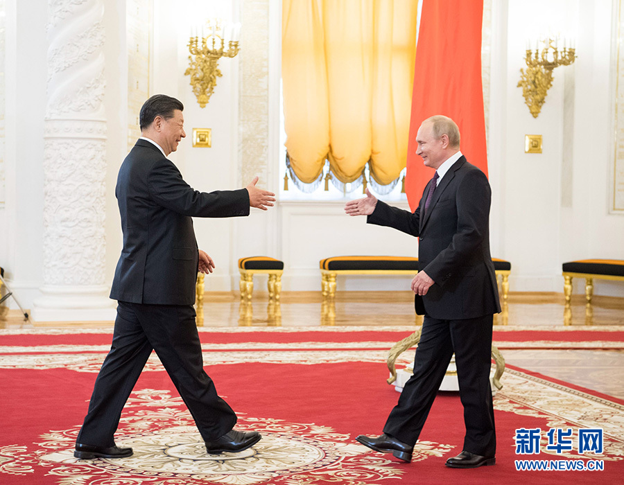 6月5日,國家主席習近平在莫斯科克里姆林宮同俄羅斯總統(tǒng)普京會談。這是會談前,兩國元首緊緊握手,合影留念。 新華社記者 丁海濤 攝
