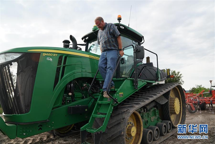 6月9日,在位于美國(guó)中部密蘇里州的小鎮(zhèn)奧里克,湯姆·沃特斯從一輛拖拉機(jī)上下來(lái)。新華社記者 劉杰 攝