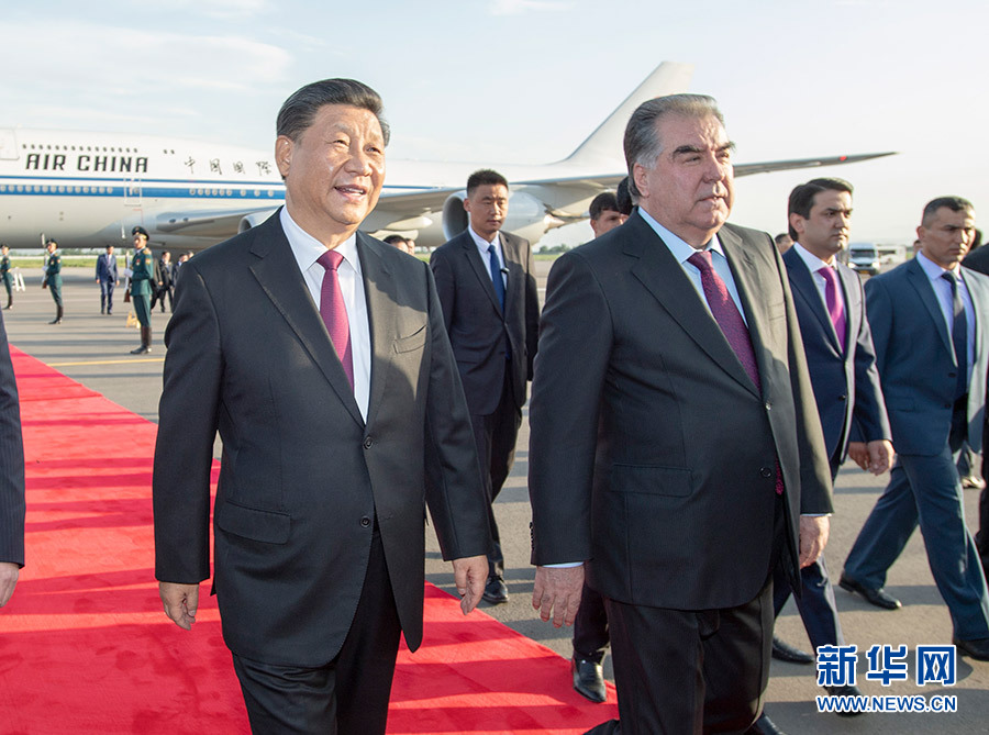 當(dāng)?shù)貢r(shí)間晚6時(shí)許,習(xí)近平乘坐的專機(jī)抵達(dá)杜尚別國際機(jī)場(chǎng)。習(xí)近平步出艙門,受到塔吉克斯坦總統(tǒng)拉赫蒙熱情迎接。塔吉克斯坦女青年向習(xí)近平獻(xiàn)花。禮兵分列紅地毯兩側(cè)。