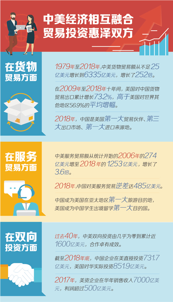 在國際經(jīng)濟合作中,正常的貿(mào)易關系是建立在等價交換基礎上的互惠互利關系,而不是你多我少、你輸我贏的“零和博弈”。國際貿(mào)易有利于推動資源在世界范圍內(nèi)優(yōu)化配置,促進各國經(jīng)濟共同發(fā)展,推動人類社會共同進步,國際貿(mào)易的歷史早已證明這樣的實踐是有效的,實踐經(jīng)驗也早已成為國際經(jīng)濟學的基本原理,中美經(jīng)貿(mào)合作的事實也作了同樣的驗證。中美建交以來,在雙邊貿(mào)易方面,1979年至2018年,雙邊貨物貿(mào)易額從不足25億美元增長到6335億美元,增長了252倍;在雙向投資領域,過去40年,中美雙向投資由幾乎為零到累計近1600億美元,中美互為對方重要投資伙伴,投資的雙向性和互惠性進一步顯現(xiàn)。中美經(jīng)貿(mào)關系發(fā)展的歷程證明,中美通過優(yōu)勢互補、互通有無,有力促進了各自經(jīng)濟發(fā)展和產(chǎn)業(yè)結構優(yōu)化升級,雙方經(jīng)貿(mào)往來是惠澤彼此的關系,而非中國讓美國“吃虧”的過程。
